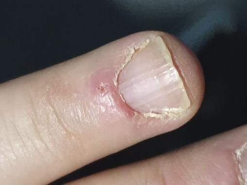 Cliniquement, on observe une inflammation périunguéale associée à une lésion ulcérée superficielle (le chancre). Contrairement aux autres localisations, le chancre au niveau du doigt est souvent très douloureux.