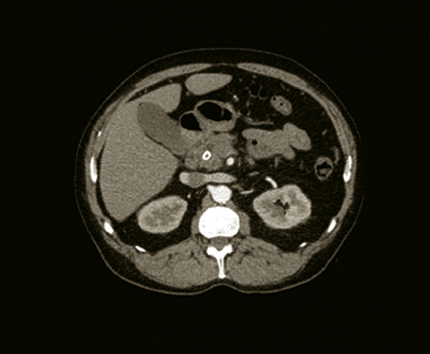 TDM abdominale sans et avec injection de produit de contraste : examen de référence (+++) ;