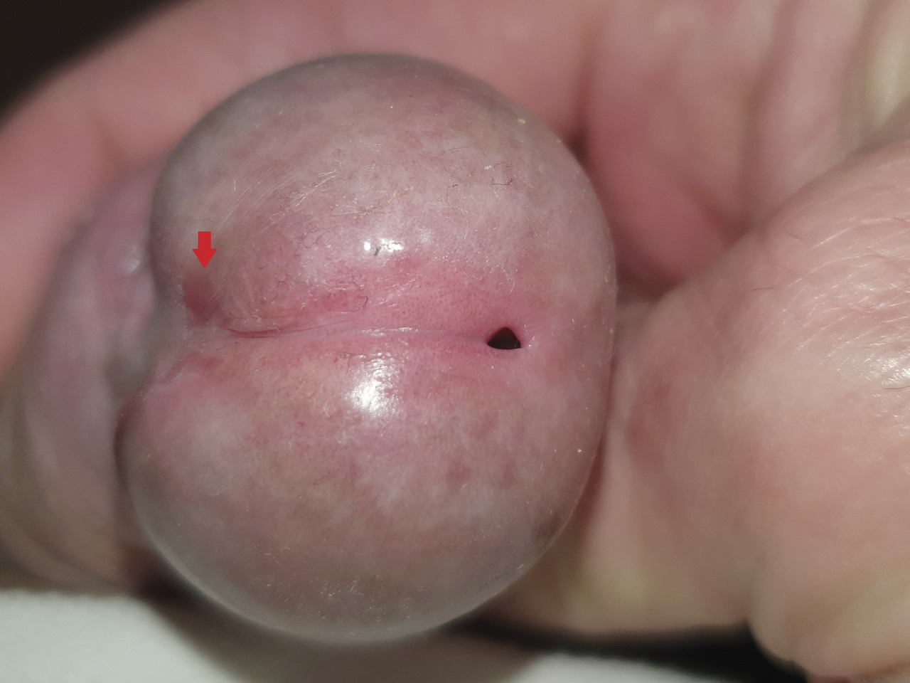 Marc, 48 ans, a depuis quelques semaines une lésion maculopapuleuse au niveau du gland (photo ). Ayant de nombreux partenaires (hommes et femmes), il craint une infection sexuellement transmissible (IST), et est très inquiet. Compte tenu de ces éléments et du caractère indolore de la lésion, une biopsie est réalisée.