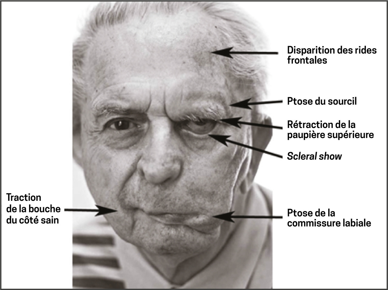 – dans les formes flasques, hypotonie se traduisant par : abaissement du sourcil ; disparition des rides du front ou du sillon naso-génien ; impossibilité de fermer l’œil (abaissement de la paupière inférieure et rétraction de la supérieure : signe de Charles-Bell) et/ou incapacité à sourire ;