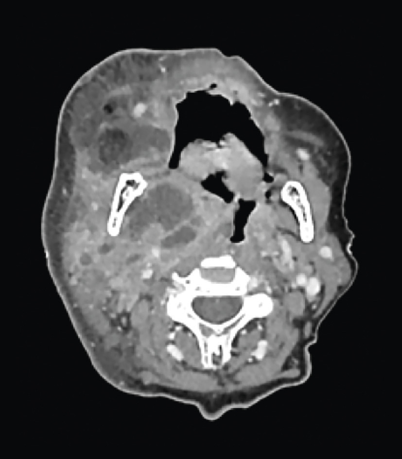 Scanner cervico-facial avec injection : infiltration sous-cutanée cervico-faciale droite diffuse, associée à un abcès de 6 x 6 cm allant de l’espace parapharyngé droit à la fosse infratemporale, occupant la région parotidienne. Thrombophlébite jugulaire interne et externe homolatérale (