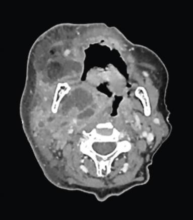 Scanner cervico-facial avec injection : infiltration sous-cutanée cervico-faciale droite diffuse, associée à un abcès de 6 x 6 cm allant de l’espace parapharyngé droit à la fosse infratemporale, occupant la région parotidienne. Thrombophlébite jugulaire interne et externe homolatérale (figure ).
