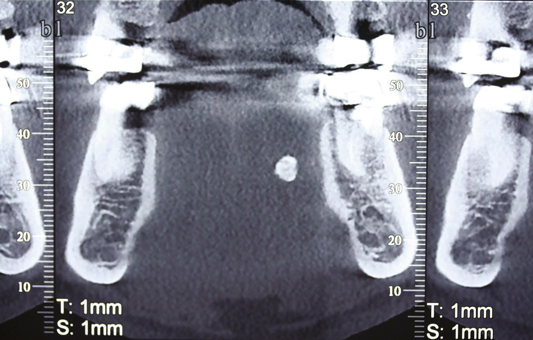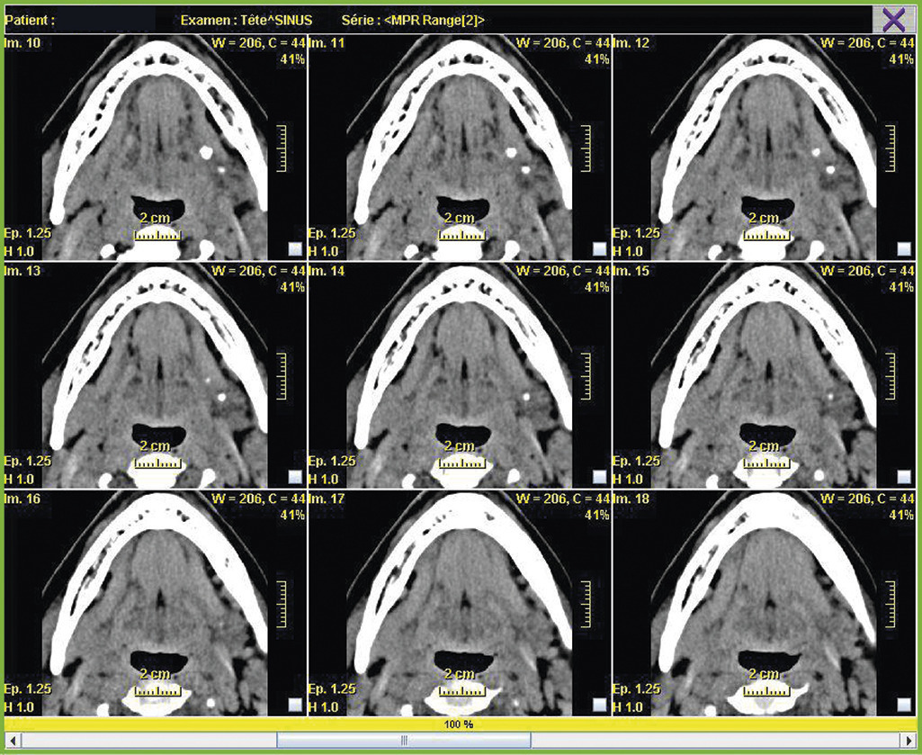 Cette tomographie volumique par faisceau conique est une technique de tomodensitométrie permettant de produire une radiographie numérisée. Cet examen peut remplacer le scanner car il est moins irradiant, moins coûteux, et présente moins d’artéfacts dentaires ; en revanche, il n’est pas pris en charge par l’Assurance maladie dans cette indication et montre mal les tissus mous (fig. 10).