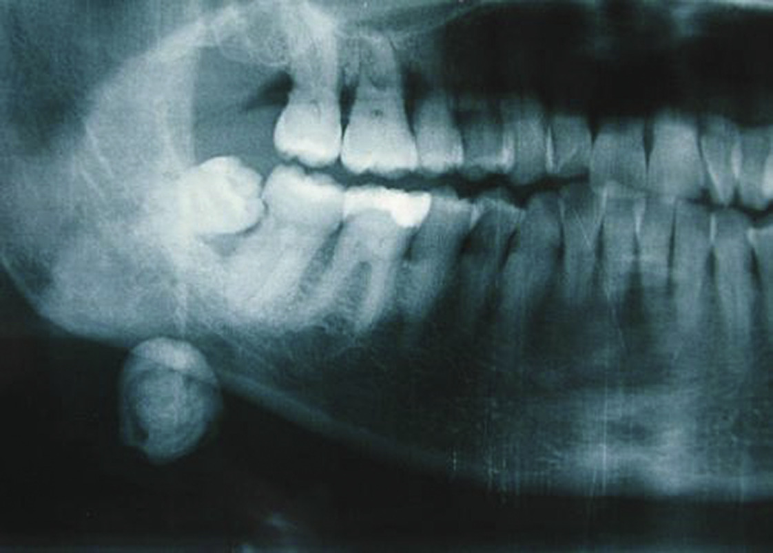 Il retrouve une image ovalaire radio-opaque le plus souvent en regard de l’encoche pré-angulaire de la mandibule. Il permet d’éliminer un potentiel diagnostic différentiel non lithiasique, principalement dentaire (fig. 8). C’est un examen de débrouillage qui reste systématique, notamment pour éliminer une autre pathologie, dentaire, par exemple.