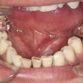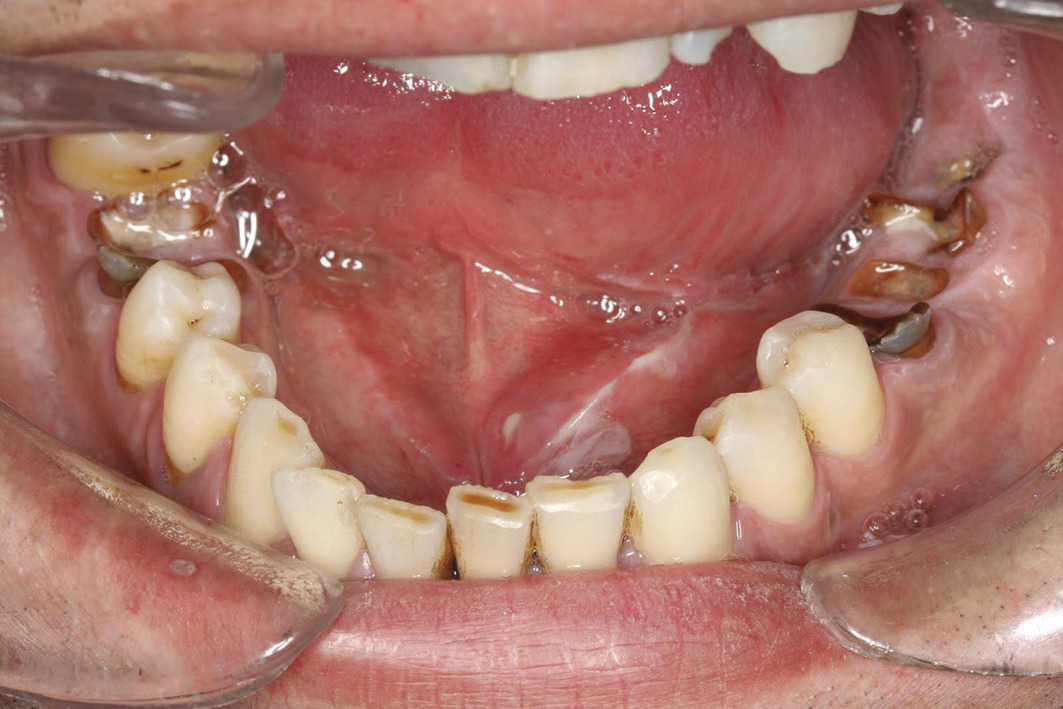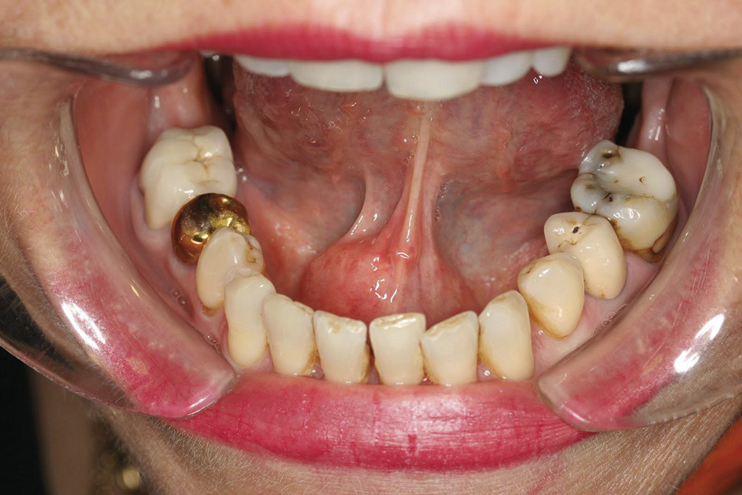 • la xérostomie, qui est le motif le plus fréquent de consultation. Les signes cliniques sont une muqueuse sèche et collante, une absence de lac salivaire au plancher buccal et une absence d’écoulement salivaire aux ostia à la palpation glandulaire. Une chéilite, une atrophie papillaire ou encore des caries aux collets des dents sont des signes indirects ;
