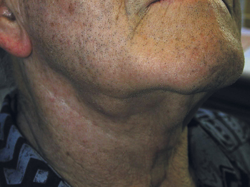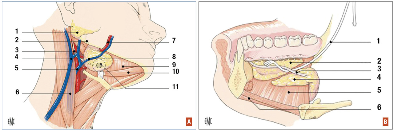 • sialadénite : infection de la glande, stricto sensu, elle se fait en amont du canal. Elle est synonyme de submandibulite aiguë. La peau en regard est chaude et érythémateuse, associée à une otalgie, une dysphagie et une fièvre modérée.