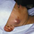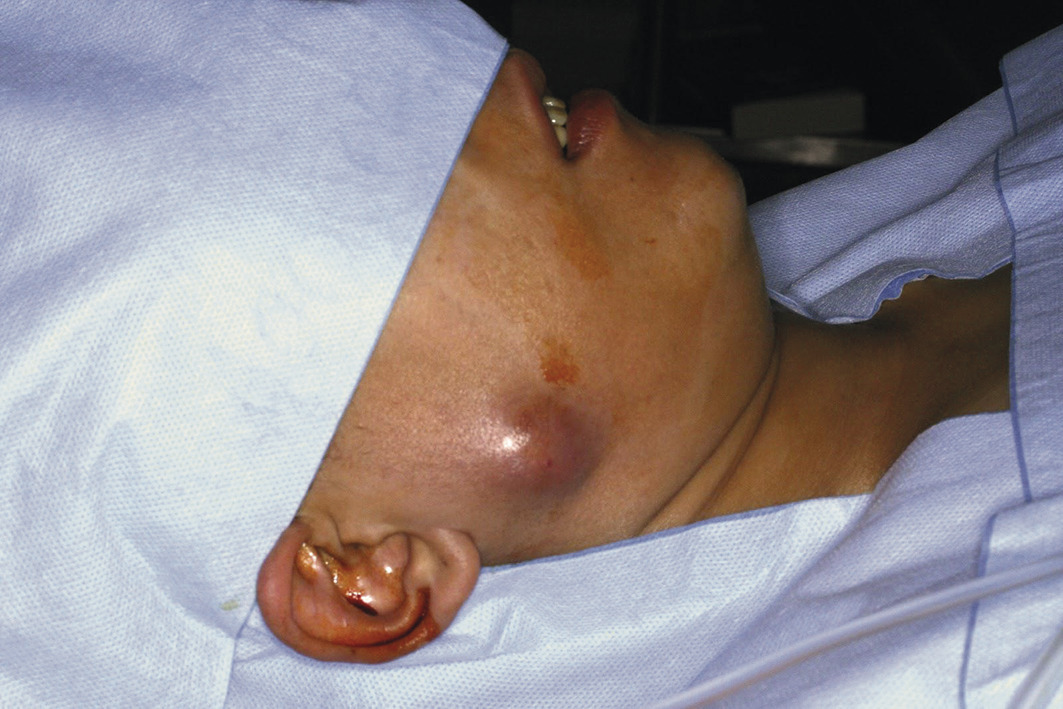 Tuméfaction isolée pré- ou infra-auriculaire qui peut soulever le lobule de l’oreille et grossit lentement.