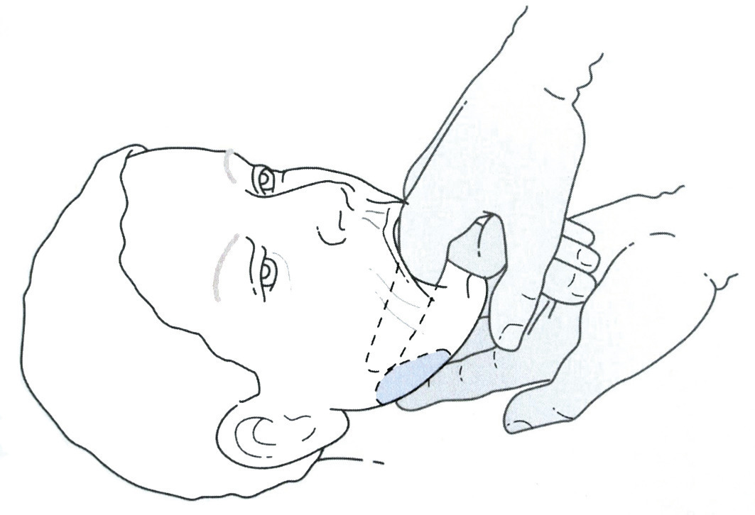 La palpation de la glande confirme le gonflement, alors que la palpation bidigitale de la glande et du conduit pratiquée d’arrière en avant (pour éviter de repousser un calcul vers le hile) recherche un calcul.