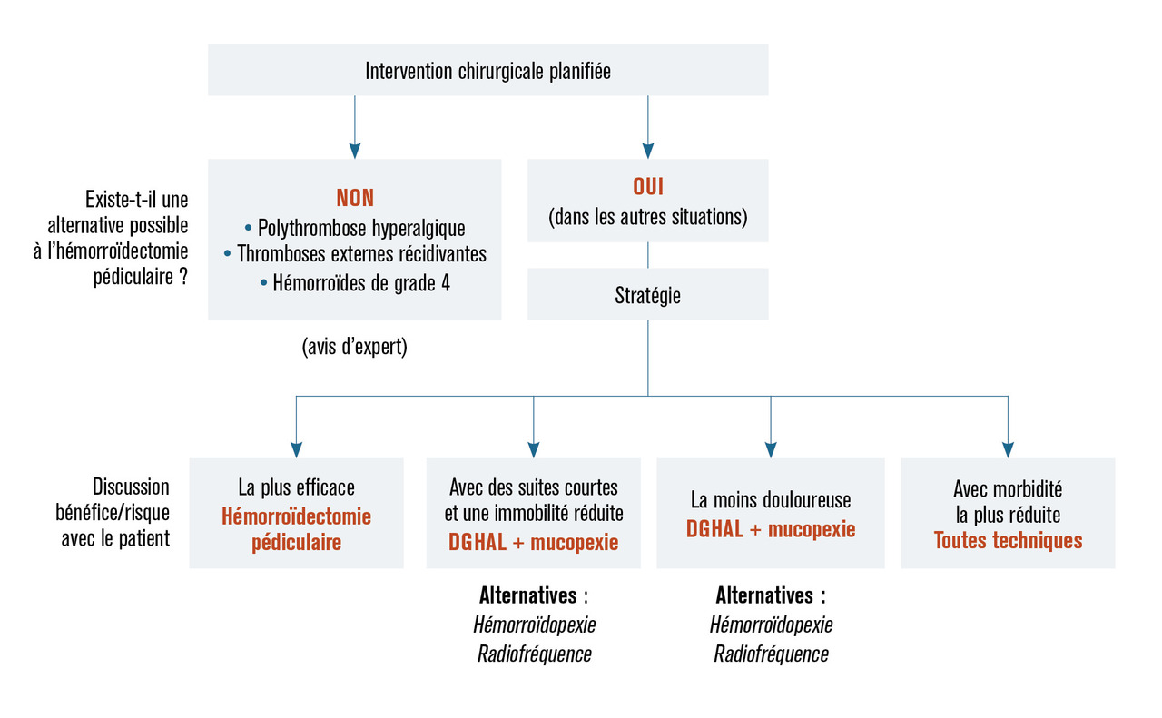 L’hémorroïdectomie pédiculaire est recommandée quel que soit le grade de la maladie hémorroïdaire. Elle peut être indiquée d’emblée en cas de complication aiguë (polythrombose hyperalgique et/ou nécrotique résistant au traitement médical), d’anémie sévère et de maladie hémorroïdaire de grade 4.