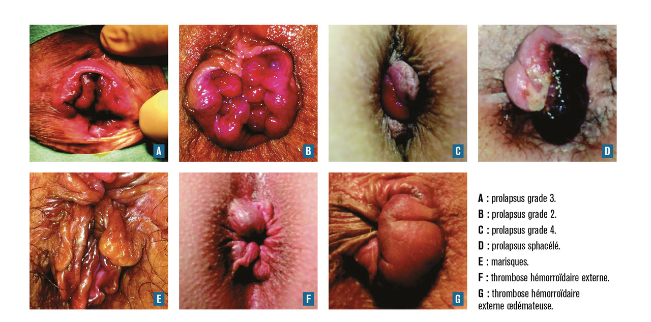 La pathologie hémorroïdaire externe se manifeste sous forme de thromboses qui peuvent laisser place à des marisques lorsque le caillot disparaît. Les hémorroïdes internes se manifestent par des rectorragies et/ou un prolapsus, plus rarement par une thrombose.