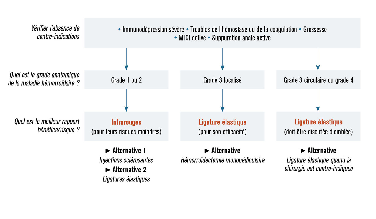 En cas de rectorragies sans prolapsus, la ligature élastique ne doit être proposée qu’en seconde intention, après échec de la photocoagulation infrarouge, aux résultats comparables, avec moins d’effets indésirables et de complications.