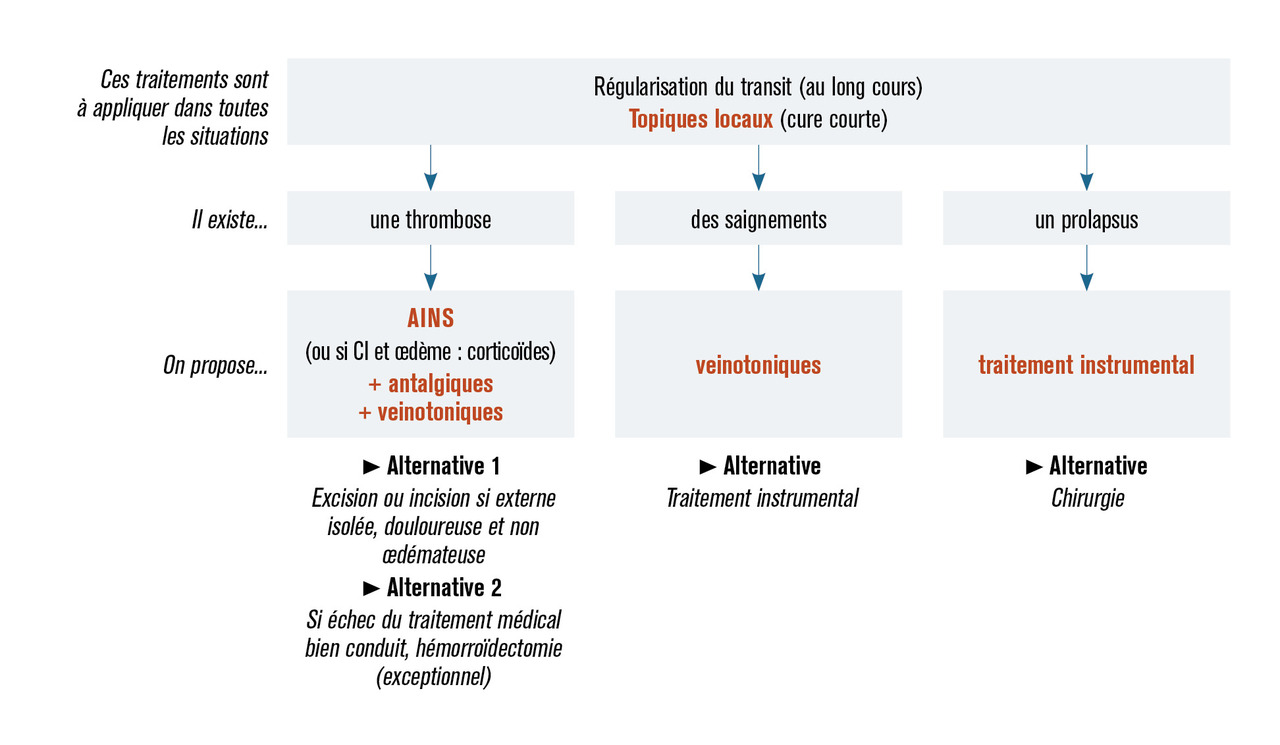 Malgré l’absence de données publiées, la coprescription est fréquente dans la pratique. En cas de thrombose hémorroïdaire, il est recommandé de proposer un traitement comportant des AINS, des antalgiques, des régulateurs du transit et des topiques. En cas de pathologie hémorroïdaire interne, il est recommandé de proposer un traitement comportant des régulateurs du transit et des topiques ; les phlébotropes sont autorisés.