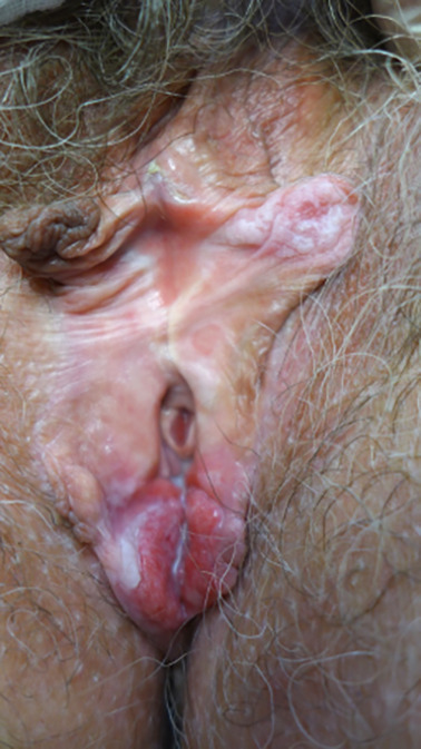 Principaux diagnostics différentiels : la fréquente atrophie/dépigmentation postménopausique (seuls le traitement d’épreuve à base de crèmes hydratantes/estrogéniques et/ou la biopsie peuvent les différencier) ; le vitiligo – simple dépigmentation asymptomatique sans altération de la qualité de la muqueuse ni des reliefs vulvaires (aucun traitement n’est requis) – et le lichen plan, beaucoup plus rare.