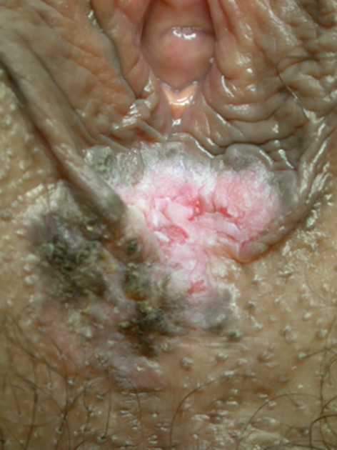 – suspicion de lésion précancéreuse, appelée VIN (Vulva Intraepithelial Neoplasia) de type différencié (dVIN) : plaque blanche/rouge épaisse ou ulcération chronique. Ces précurseurs directs de cancer ont un temps moyen de progression de 2 ans (5 mois-10 ans). Une exérèse chirurgicale préventive est indiquée. En effet, deux tiers des carcinomes épidermoïdes invasifs se développent sur un lichen scléreux, et en particulier sur ceux qui ont cet aspect de lésion à risque (cependant, moins de 5 % des lichens scléreux se « cancérisent »).