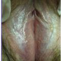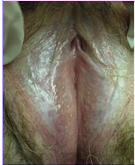 Dans la forme typique, son diagnostic est clinique : on observe sur les versants internes de la vulve (petites lèvres, espaces interlabiaux, capuchon clitoridien) une coloration blanche, brillante, nacrée, à bords bien limités, classiquement bilatérale et symétrique et une atrophie variable des reliefs vulvaires : effacement des petites lèvres, encapuchonnement du clitoris respectant le vagin (fig. 1). Les fissures, douloureuses, sont fréquentes. Le périnée est très souvent atteint, ainsi que la peau périanale.