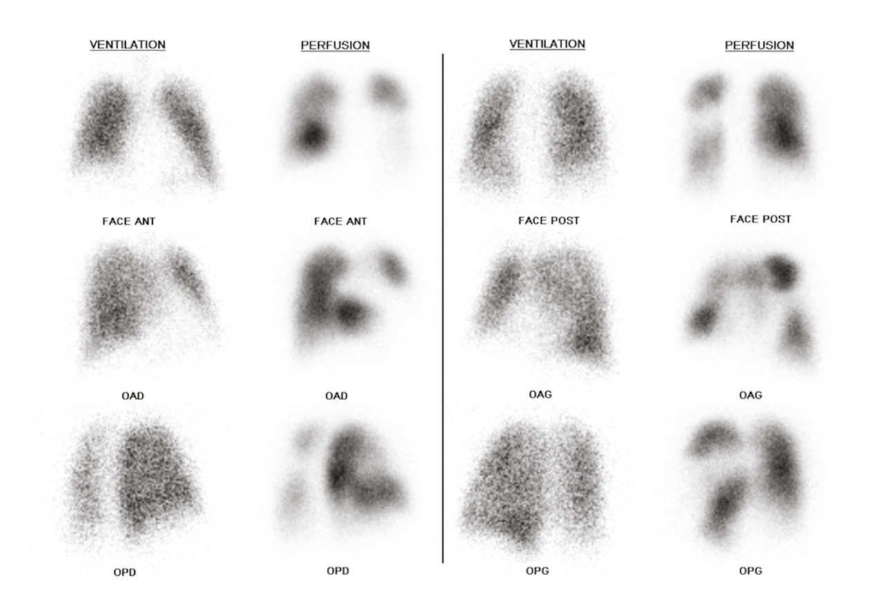 Monsieur M. est adressé par son cardiologue dans un centre de compétence en hypertension pulmonaire. Le cathétérisme cardiaque droit confirme le diag- nostic d’hypertension pulmonaire précapillaire avec une PAPm à 73 mmHg et une PAPo à 12 mmHg. La scintigraphie pulmonaire objective de multiples défects perfusionnels segmentaires et sous-segmentaires bilatéraux sans anomalie ventilatoire en regard (fig. 5).