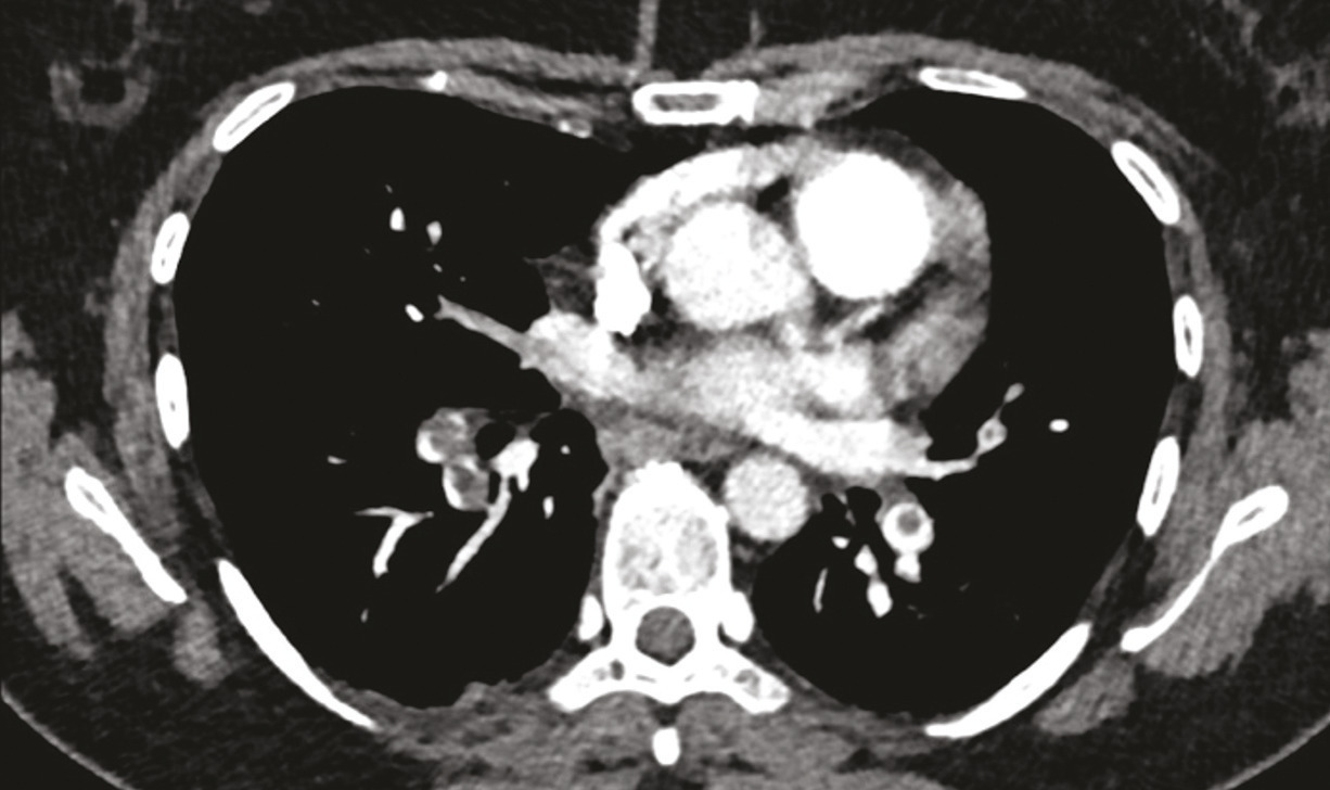 Dans le cas de monsieur M., l’embolie pulmonaire étant probable (en raison de l’antécédent de thrombose veineuse profonde et de la tachycardie à 115 batt/min), l’angio-TDM thoracique est réalisée d’emblée et confirme le diagnostic d’embolie pulmonaire proximale bilatérale (fig. 2) avec dilatation des cavités cardiaques droites et reflux dans la veine cave inférieure.