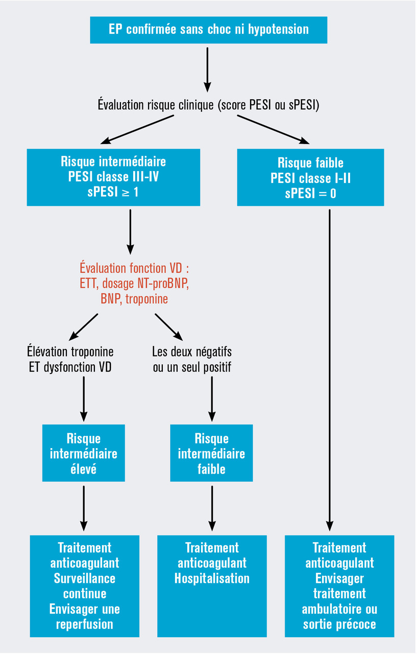 Chez les patients à risque intermédiaire, l’évaluation des lésions myocardiques (via le dosage d’un biomarqueur tel que la troponine, le peptide natriurétique de type B [BNP] et sa fraction terminale [NT-proBNP]) et de la fonction ventriculaire droite (par échocar- diographie) permet de différencier les patients à risque intermédiaire élevé et ceux à risque intermédiaire faible (fig. 3). Cette stratification du risque de mortalité précoce permet de décider d’une orientation adaptée du patient en hospitalisation conventionnelle ou en unité de soins intensifs, ainsi que de la nécessité de reperfusion primaire.