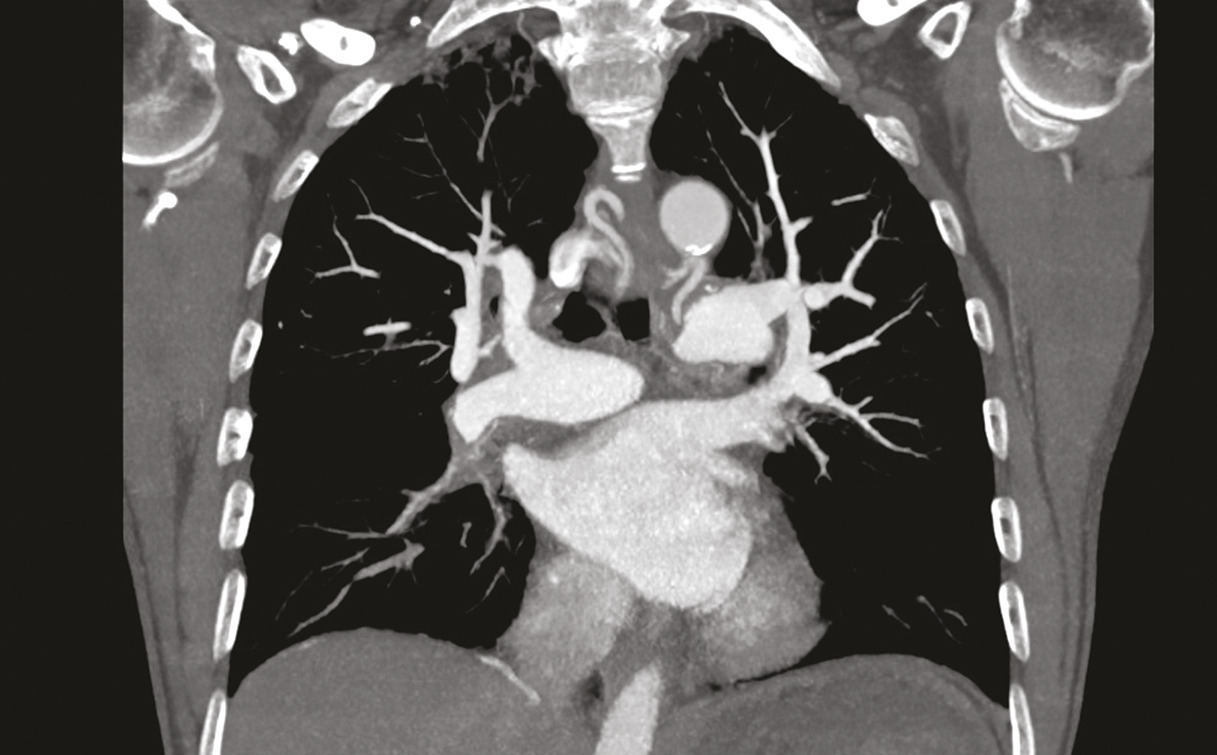 Trois ans plus tard, monsieur M. se plaint d’une dyspnée chronique d’apparition progressive l’amenant à consulter son médecin traitant. Il décrit une dyspnée pour des efforts minimes, classée NYHA III, accompagnée d’une toux chronique sèche. L’examen clinique montre une saturation en oxygène en air ambiant à 92 %, une auscultation pulmonaire normale, des bruits du cœur réguliers sans souffle à 88 batt/min accompagnés d’un éclat du deuxième bruit et d’œdèmes des membres inférieurs bilatéraux symétriques remontant jusqu’aux genoux. Un ECG est réalisé, révélant un bloc de branche droit. La radiographie thoracique ne révèle pas d’anomalie notable et les gaz du sang trouvent une hypoxémie à 67 mmHg et une PaCO2 à 2 mmHg.