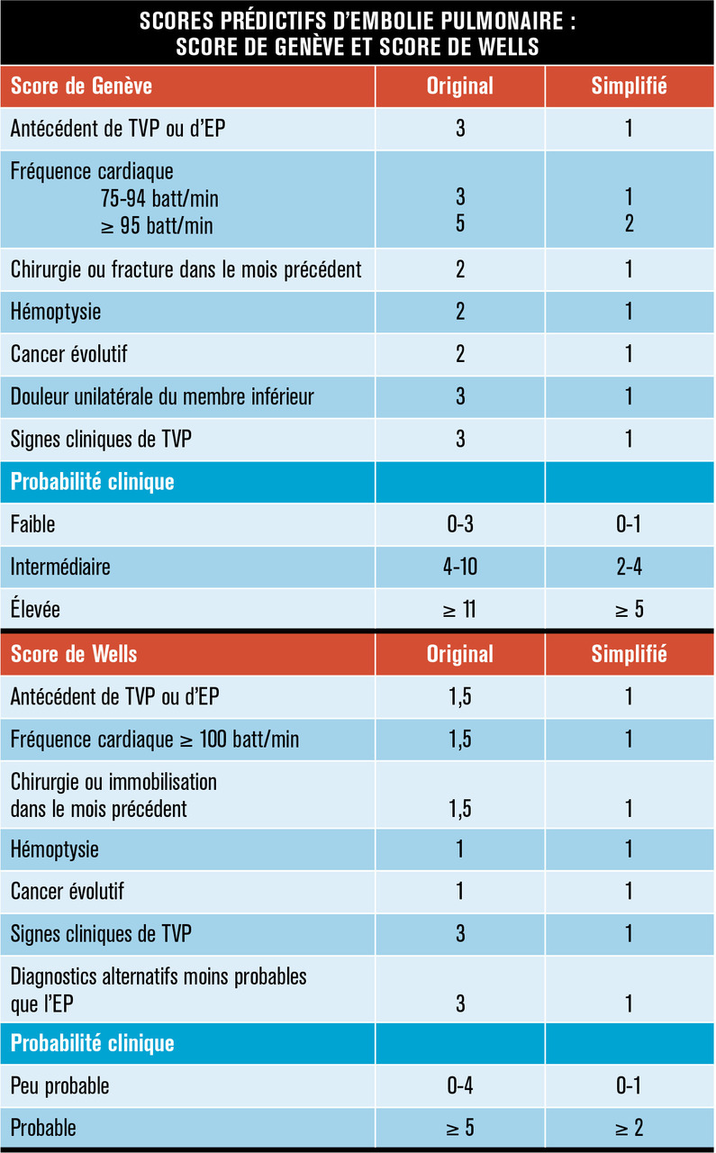 En l’absence d’hypotension artérielle, la probabilité clinique d’embolie pulmonaire doit être évaluée à l’aide d’un score prédictif validé tel que le score de Wells ou le score de Genève (tableaux 1 et 2). Cette probabilité clinique détermine la stratégie diagnostique.1