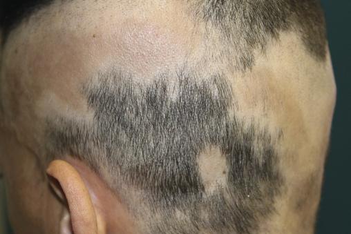 Marc, 24 ans, consulte car il a constaté une chute importante de ses cheveux depuis quelques semaines. L’examen montre de multiples placards circulaires dépourvus de tiges pilaires dans la partie centrale.
