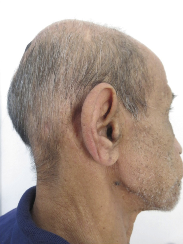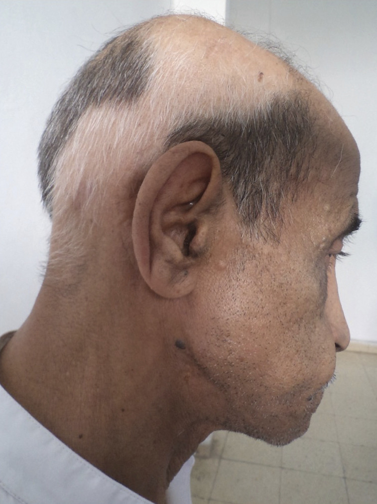 Ce patient de 62 ans se présentait en consultation pour un blanchiment en plages de ses cheveux. L’examen notait une raréfaction des cheveux au niveau des zones blanches (fig. 1 ). Le diagnostic de pelade était retenu. Le patient ne désirait pas de traitement. Une repousse spontanée est survenue après 6 mois (fig. 2 ).