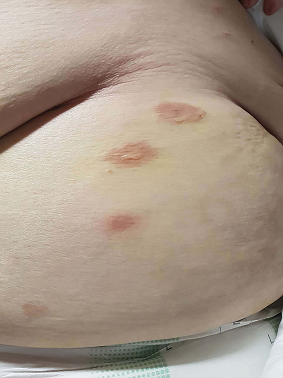 Alice, 82 ans, a été traitée par corticothérapie orale il y a 2 mois pour des lésions bulleuses abdominales (figure ) attribuées à un prurigo strophulus. En l’absence d’amélioration, un prélèvement cutané est réalisé.