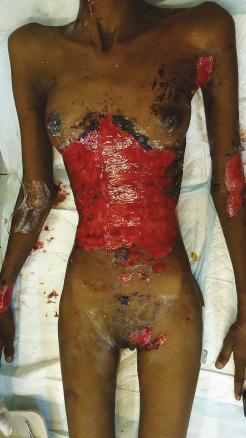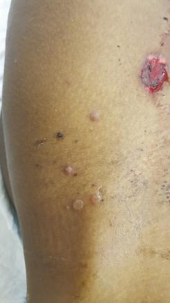 Cette jeune Tchadienne de 17 ans avait depuis 3 mois des lésions ulcéro-nécrotiques des muqueuses apparues simultanément au niveau de la bouche, des organes génitaux et des yeux. Les lésions s’étaient progressivement étendues en peau saine avec des lésions bulleuses coalescentes, érosives et délabrantes (fig. 1 et 2). La biopsie réalisée au Tchad, conservée dans le formol et examinée en France, montrait une acantholyse suprabasale, confirmant un pemphigus. Un traitement par prednisone forte dose (1 mg/kg) avec une décroissance progressive associé à des soins locaux permettait une cicatrisation complète en 2 mois et demi. Aucun immunosuppresseur n’étant disponible au Tchad, le traitement d’entretien était poursuivi par corticoïdes à faible dose (10 mg/j) au prix d’un hypercorticisme important.