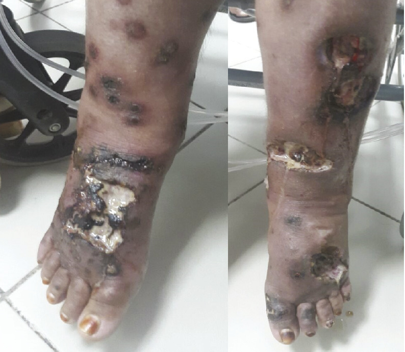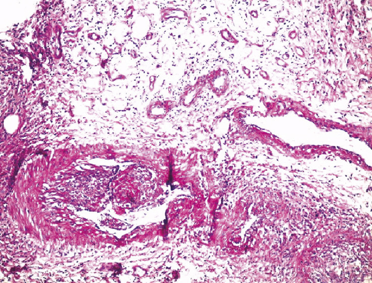 Cette femme de 50 ans sans antécédents notables était hospitalisée pour des ulcères chroniques des membres inférieurs. Six mois auparavant, des nodules fermes indolores étaient apparus au niveau des membres inférieurs, évoluant vers la fistulisation et la confluence, et donnant lieu à de nombreux ulcères. L’examen clinique notait de multiples ulcères des membres inférieurs nécrosants, surinfectés et creusants, à bordure, surélevés, mimant un pyoderma gangrenosum (fig. 1), sans arthralgies ni myalgies. Le bilan biologique montrait un syndrome inflammatoire biologique, le bilan auto-immun était négatif, de même que les sérologies des hépatites B et C et du VIH, l’échographie doppler artérielle et veineuse, et le bilan de systématisation. L’étude histologique (fig. 2) confirmait le diagnostic de périartérite noueuse. La patiente était traitée par des bolus de méthylprednisone avec un relais par la prednisone 1 mg/kg/j per os, associée à une seule cure de plasma riche en plaquettes. L’évolution était marquée par un début d’amélioration clinique, mais la patiente était ensuite perdue de vue.