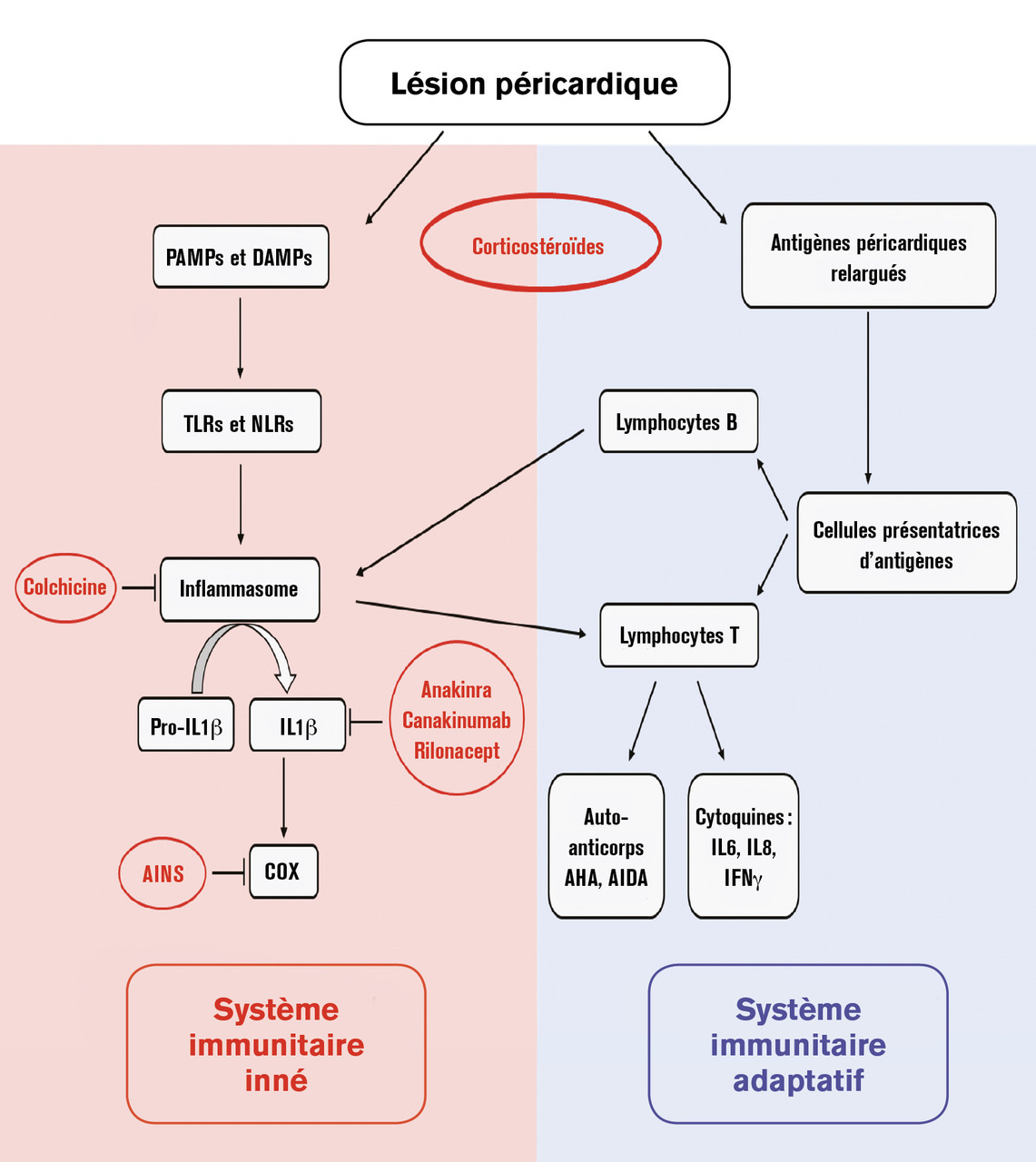 À l’inverse, les maladies auto-inflammatoires telles que les syndromes périodiques associés à la cryopyrine et la fièvre méditerranéenne familiale sont caractérisées par l’apparition spontanée de poussées inflammatoires intermittentes avec fièvre et sérite incluant fréquemment une péricardite. Dans la péricardite récurrente, le mécanisme auto-inflammatoire peut résulter de l’activation de l’inflammasome par un virus cardiotrope ou un agent non spécifique chez un patient qui a une immunité innée anormale. Cela entraîne la libération de cytokines pro-inflammatoires, y compris les interleukines – principalement l’IL-1 – qui amènent les neutrophiles et les macrophages dans la zone lésée.