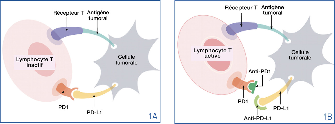 L’interaction entre le récepteur PD1 (Programmed cell Death 1), présent à la surface des lymphocytes T, et PD-L1, son ligand exprimé par la tumeur, aboutit à cette « tolérance » (fig. 1A-B). L’administration d’un anticorps monoclonal anti-PD1 ou anti-PD-L1 lève l’inhibition lymphocytaire.