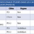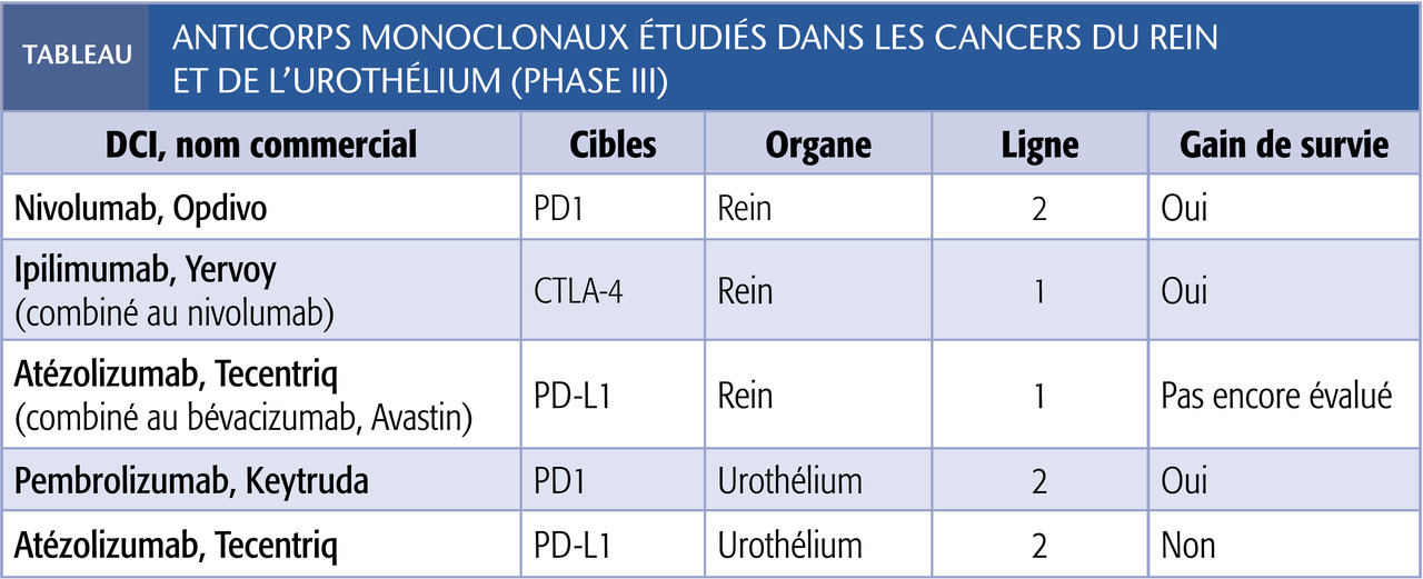 Le nivolumab, anticorps monoclonal humain anti-PD1, a été évalué après échec d’un anti-angiogénique, un inhibiteur du VEGF-R (récepteur du Vascular Endothelial Growth Factor). Une étude randomisée de phase III comparant cette molécule (3 mg/kg en perfusion IV courte d’une heure en hôpital de jour tous les 14 jours) à l’évérolimus (anti-angiogénique ciblant la protéine mTOR - mammalian Target Of Rapamycin) montre une réduction du risque de décès de 27 % en faveur du nivolumab (médianes de survie de 25 vs 19,6 mois).1 Dans l’ensemble, la tolérance est meilleure que celle des médicaments ciblant la néo-angiogenèse. Des manifestations générales (fatigue, pics fébriles lors des perfusions) et spécifiques peuvent néanmoins survenir chez environ 10 % des patients : cutanées (éruptions maculo-papuleuses), digestives (colites avec diarrhées), endocriniennes (hypothyroïdie, hyperthyroïdie, hypophysite), hépatiques (élévation asymptomatique des transaminases), pulmonaires (pneumopathie inter-stitielle) et cardiaques (myocardite). Ces effets indésirables, si sévères, imposent une prise en charge rapide par un spécialiste.