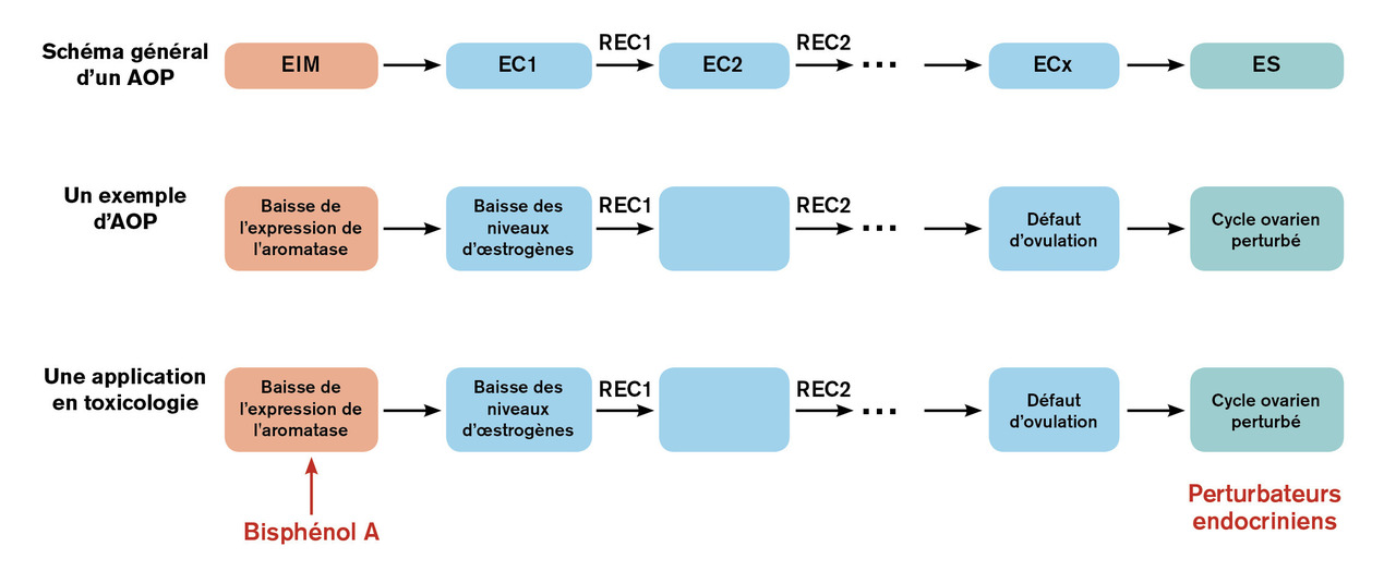 Comme nous l’avons vu, la définition même des perturbateurs endocriniens met en avant leur mécanisme d’action puisqu’il s’agit d’aller de la perturbation d’une fonction endocrinienne à l’impact toxique et sanitaire. Cette orientation est en fait assez générale actuellement, et elle intéresse particulièrement les agences réglementaires. Ainsi, les connaissances existantes sont intégrées sous forme d’« adverse outcome pathways » (AOPs). Les AOPs correspondent à des enchaînements d’événements : partant d’un événement initiateur moléculaire (inhibition d’une enzyme dans le cas décrit (