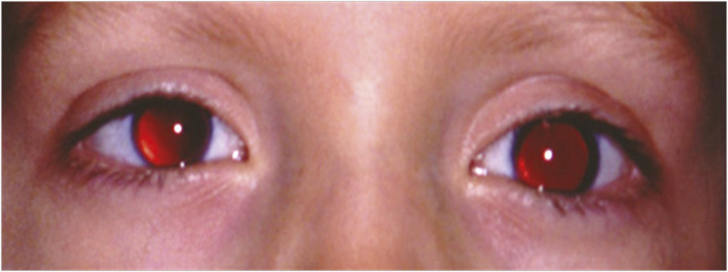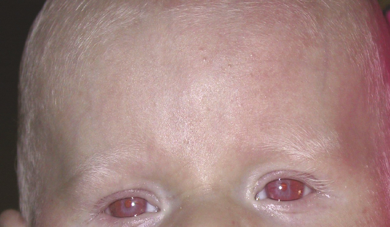 Les atteintes congénitales de l’iris, telles que l’aniridie (absence d’iris [fig. 8]) ou l’albinisme (manque de pigment dans les tissus oculaires et plus ou moins dans la peau [fig. 9]) donnent une photophobie variable plus précoce, présente à partir de quelques mois de la vie.