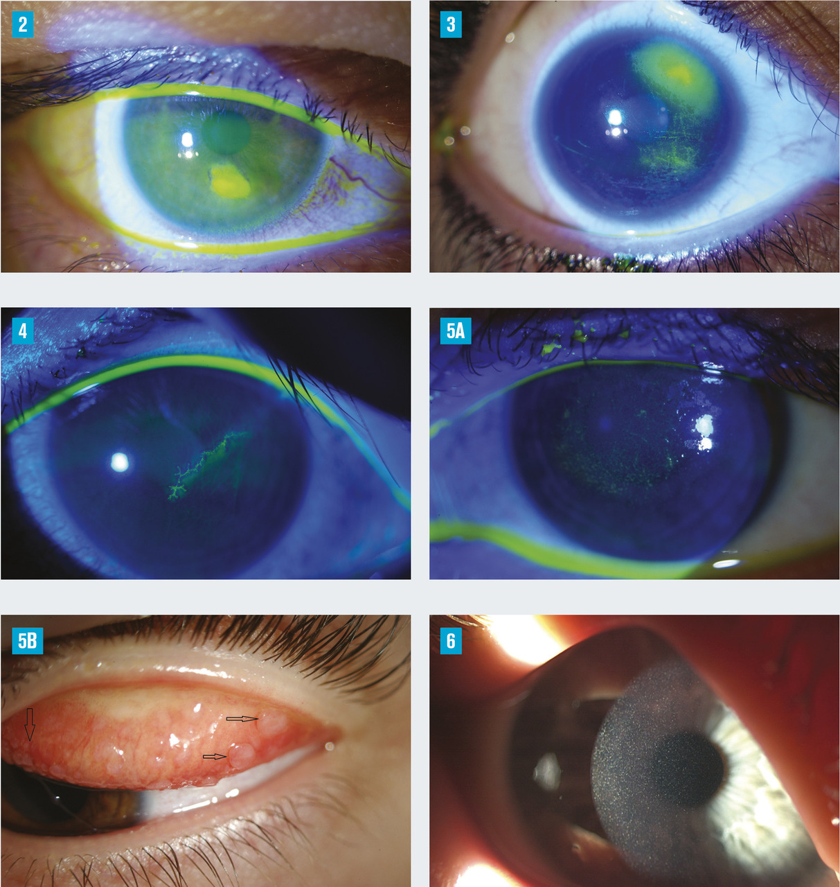 Les pathologies de la cornée sont de grandes pourvoyeuses de photo-aversion et de spasmes des paupières (blépharospasme). Toutes les atteintes de l’intégrité de l’épithélium ou du stroma cornéen vont se solder par une photophobie. Les abrasions cornéennes traumatiques (coup d’ongle, etc.) et les corps étrangers superficiels sont une cause majeure de consultation chez le spécialiste (fig. 2 et 3). Suivent les kératites infectieuses (notamment herpétiques [fig. 4]) et allergiques (kératoconjonctivite vernale [fig. 5]). Beaucoup plus rares sont des maladies héréditaires de la cornée, telles que les dystrophies opacifiantes et les dépôts liés aux erreurs innées de métabolisme (par exemple cystinose [fig. 6]). Ces maladies se manifestent souvent à l’adolescence.