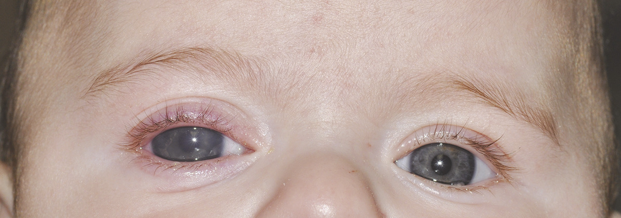 Cette pathologie grave se manifeste chez un nourrisson de quelques semaines de vie par une triade classique incluant une photophobie, un écoulement de larmes claires sur la joue, sans signe inflammatoire ni obstruction du canal lacrymo-nasal (épiphora) et un blépharospasme. Une buphtalmie (« grand bel œil » ou œil bovin, distendu avec la sclère fine bleuâtre) arrive plus tardivement (fig. 7). Le diagnostic est confirmé par la prise des paramètres oculaires sous anesthésie générale (pression intraoculaire, diamètre de la cornée, longueur oculaire antéro-postérieure). C’est une urgence chirurgicale.