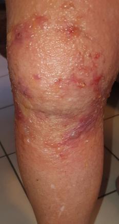 Cliniquement, des réactions à type d’eczéma vésiculo-bulleux (80 %), pouvant suinter et souvent associées à un prurit, sont le plus souvent observées. Ces lésions sont, dans la très grande majorité des situations, consécutives à une exposition solaire. En effet, elles sont observées l’été dans 75 % des cas. Une sécheresse du revêtement cutané est également possible.