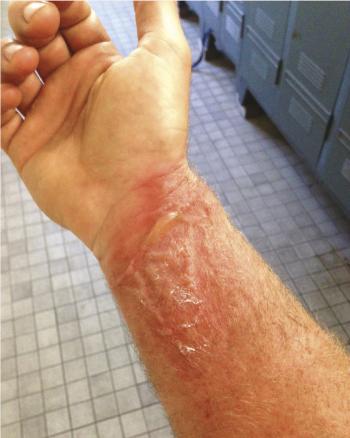 Ces deux marins consultaient pour des lésions cutanées douloureuses en regard de la main et du poignet (fig. 1 et 2) apparues le lendemain d’une sortie d’aguerrissement en extérieur (garrigue méditerranéenne, milieu humide) lors d’une journée ensoleillée. L’interrogatoire ne trouvait aucun antécédent similaire ni maladie systémique connue. L’examen clinique montrait des lésions érythémateuses et vésiculo-bulleuses à liquide clair sans signes généraux ni prurit ni adénopathie satellite ; le signe de Nikolsky ne montrait pas de décollement secondaire. Devant cet aspect de brûlure localisée, une phytophotodermatose était suspectée. L’évolution était favorable sous traitement topique, dermocorticoïde et émollient, associé à des soins locaux antiseptiques. Après la résorption complète des lésions, une discrète pigmentation séquellaire persistait.