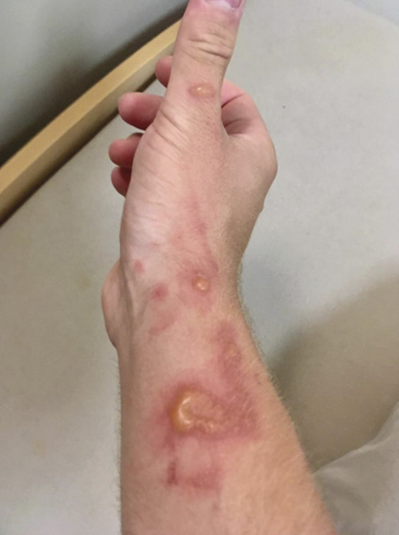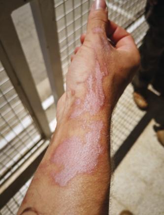 M. O., 24 ans, consulte pour une éruption cutanée apparue progressivement la veille au soir, après une après-midi de marche dans la garrigue et de baignade en mer dans le Parc national des Calanques. Les lésions sont érythémateuses, bulleuses, bien délimitées, prurigineuses et légèrement douloureuses, localisées à la main et l’avant-bras droits (