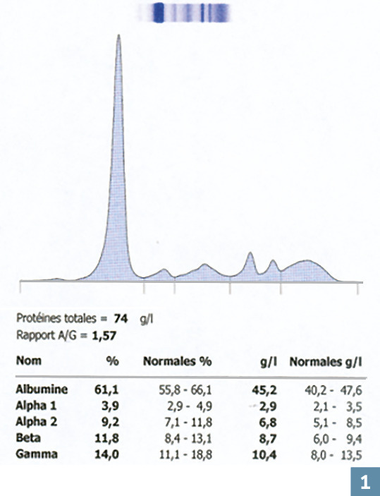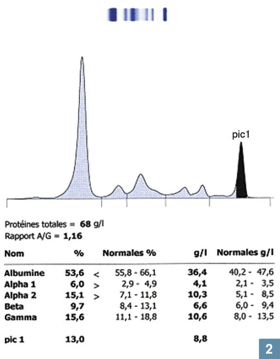 à savoir, une EPS seule ne permet pas d’affirmer le caractère monoclonal d’une anomalie. Mais, à l’inverse, une EPS normale n’exclut pas une Ig monoclonale, même s’il existe une hypogammaglobulinémie. Ainsi, en cas de suspicion clinique d’une gammapathie monoclonale, il est préférable de prescrire nommément la recherche d’une Ig monoclonale car l’EPS seule, dans certaines situations, peut être mise en défaut.