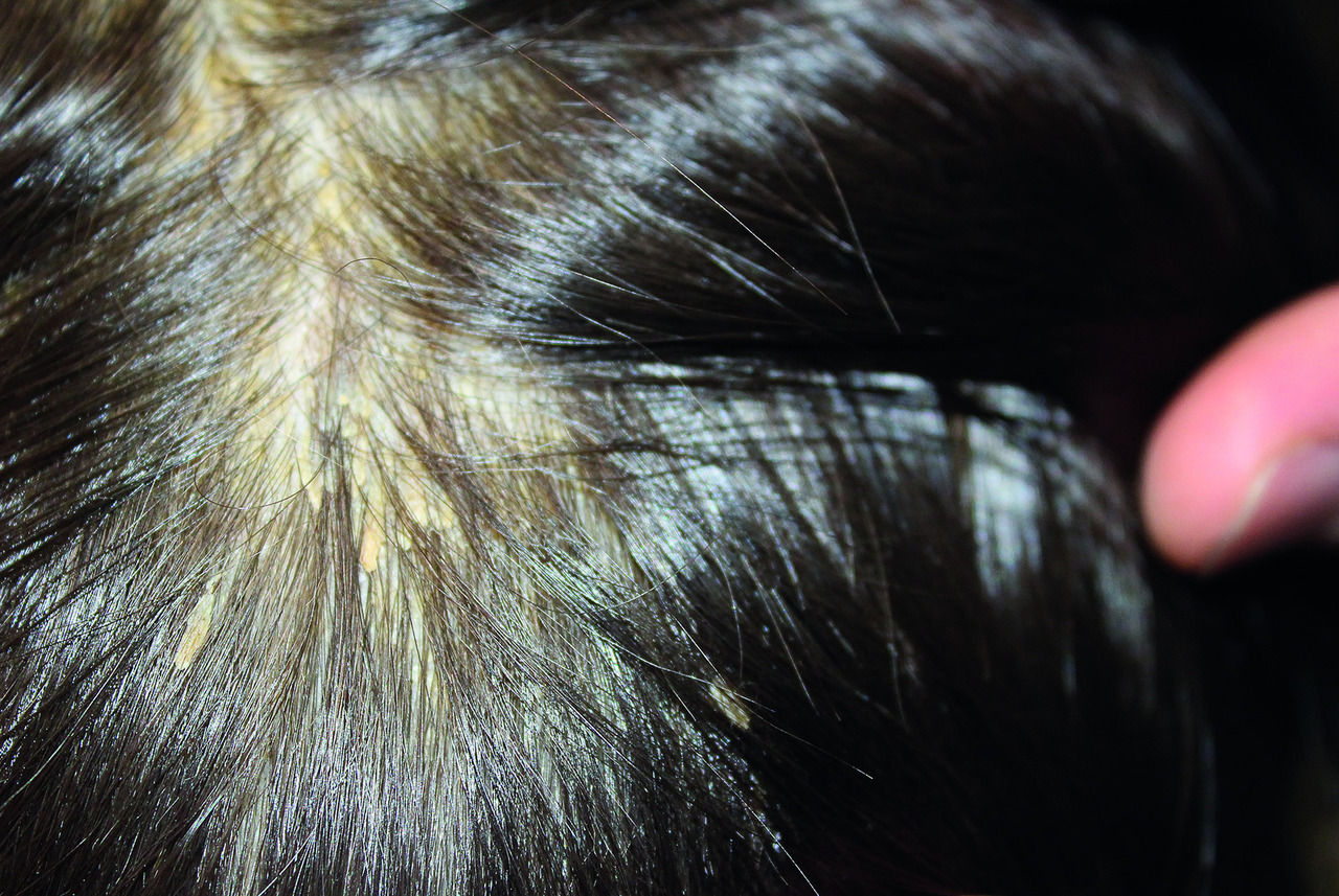 À l’examen, les squames, épaisses, de couleur blanche ou jaune, adhérentes, engainent les tiges pilaires. Le prurit qu’elles déclenchent conduit parfois à s’arracher les cheveux. Chez les jeunes patients, ces plaques alopéciques font plutôt penser à une teigne tondante.