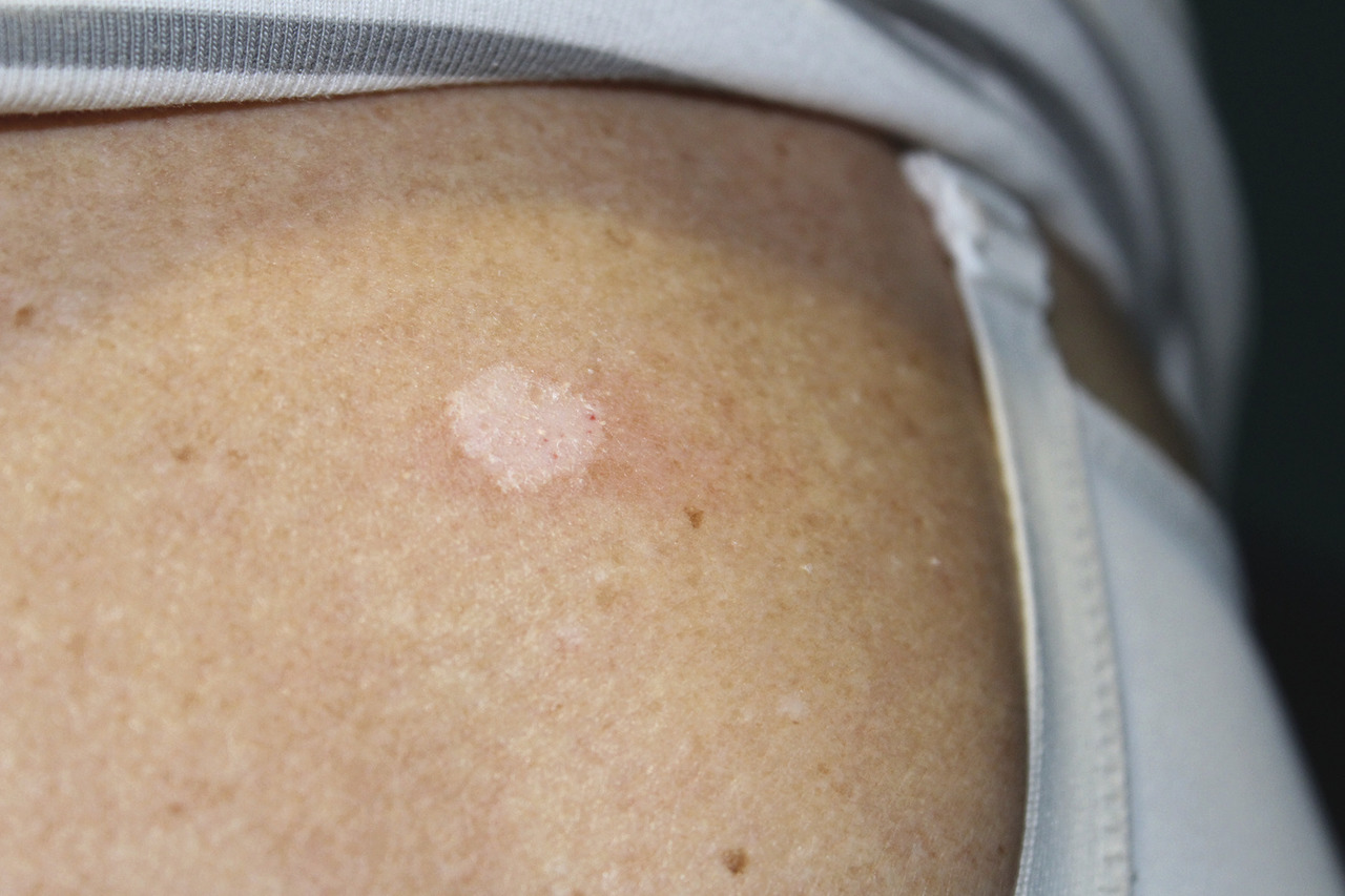Michèle, 69 ans, consulte car depuis quelques semaines son époux a remarqué une tache achromique bien limitée au niveau de son dos. L’examen attentif montre des squames dans le centre de la lésion.