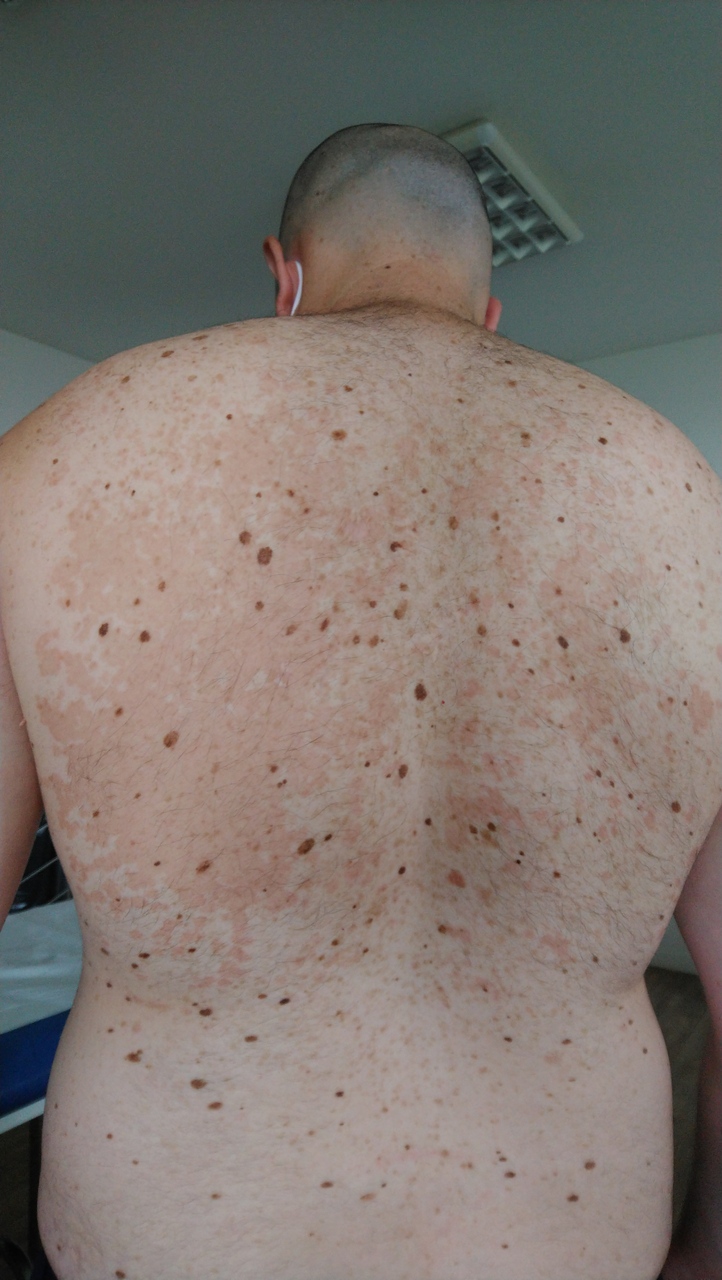 Lors d’une visite de médecine du travail systématique, un militaire s’interroge sur des lésions de couleur chamois, rondes, non prurigineuses apparues progressivement au niveau de son dos depuis un mois (figure). Le tableau clinique fait suspecter un Pityriasis versicolor.