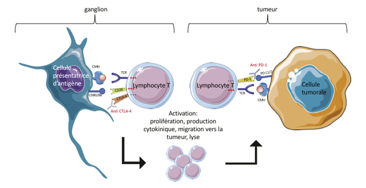 Le système immunitaire joue un rôle clé dans la clairance des cellules tumorales. L’immunothérapie antitumorale approuvée dans le traitement du mélanome aux stades avancés cible les points de contrôles immunitaires impliqués dans l’activation lymphocytaire T : PD-1 (programmed cell death 1) et CTLA-4 (cytotoxic T-lymphocyte-associated protein 4) :– CTLA-4 est un récepteur immunitaire homologue au CD28 ; CD28 est une molécule de costimulation permettant l’activation du lymphocyte T lors de la présentation de l’antigène par une cellule présentatrice d’antigène (cellule dendritique, complexe majeur d’histocompatibilité 1/2 [CMH-1/2]) au niveau du ganglion lymphatique ; CTLA-4 a une affinité plus forte que CD28 aux ligands CD80/86 et génère un signal inhibiteur au lymphocyte T ;