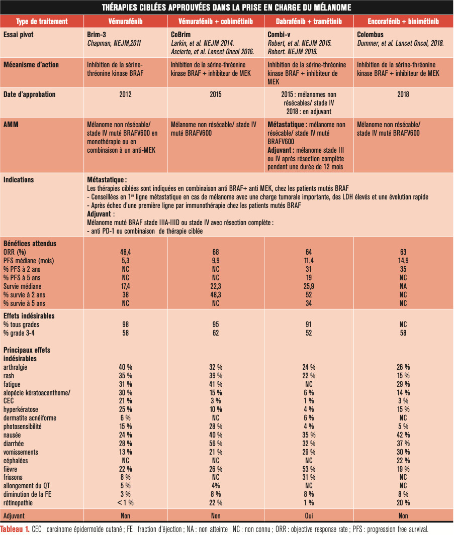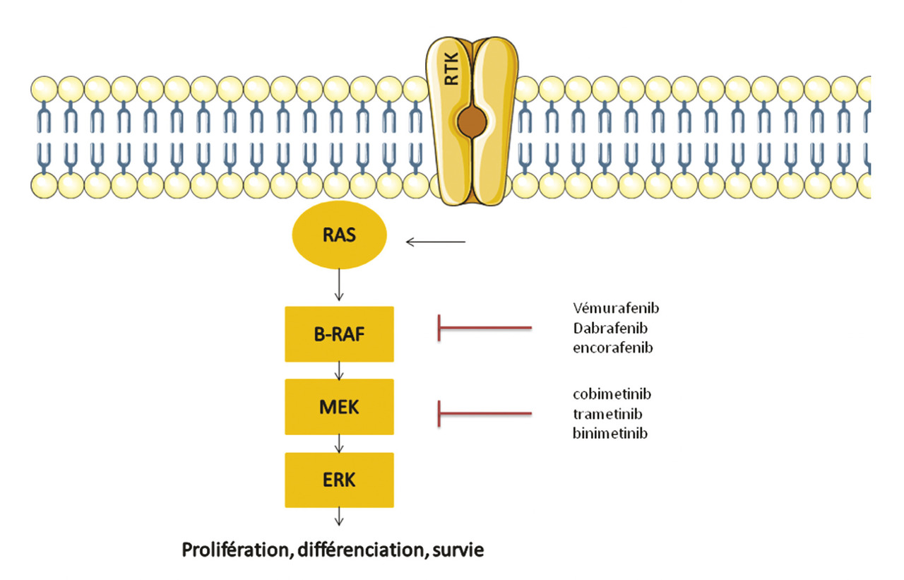 Environ 40 % des mélanomes cutanés sont mutés BRAF V600 et 20 % sont mutés NRAS. Ces mutations entraînent une suractivation de la voie des MAPkinases impliquée dans la prolifération, la différenciation et la survie cellulaire. La découverte de ces mutations a permis l’émergence des thérapies ciblées : les inhibiteurs de BRAF puis les inhibiteurs de MEK (Actuellement, ce sont les combinaisons anti-MEK/anti-BRAF qui sont couramment utilisées chez les patients mutés BRAF. Les associations vémurafenib plus cobimétinib et dabrafénib plus tramétinib ont eu l’autorisation de mise sur le marché (AMM) en 2015. Ces deux combinaisons étaient comparées dans les essais pivots au vémurafénib en monothérapie. Elles permettaient une augmentation du taux de réponse objective tout en diminuant la survenue d’effets indésirables de grades 3 et 4 (