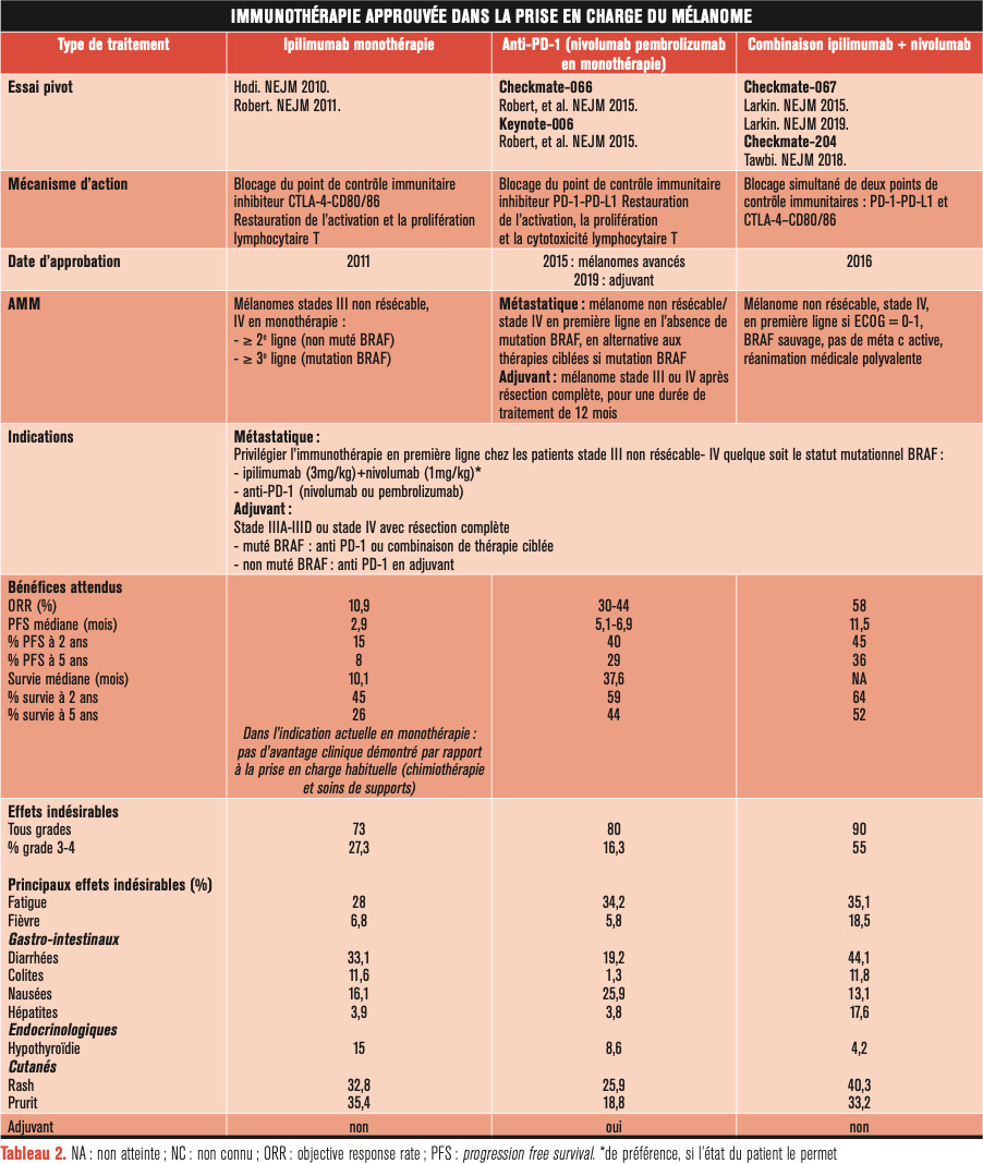 L’immunothérapie repose actuellement principalement sur l’utilisation des anticorps anti-PD-1 : le nivolumab et le pembrolizumab, qui ont prouvé un gain en survie sans progression et en survie globale obtenu en comparaison à l’ipilimumab en monothérapie. Ils ont tous les deux obtenu l’AMM en 2015 pour la prise en charge du mélanome avancé non muté BRAF en première ligne, sinon en alternative aux thérapies ciblées en cas de mutation BRAF.