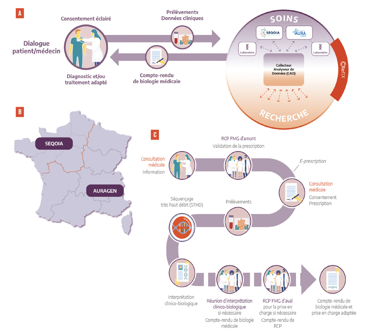 Contrairement aux autres plans nationaux de génomique, le plan français s’inscrit d’emblée dans le soin, avec des retombées directes pour les patients (diagnostic, conseil génétique, prise en charge médicale et thérapeutique). Un parcours de soins générique a ainsi été défini pour permettre l’accès au séquençage à très haut débit (fig. 1C ).