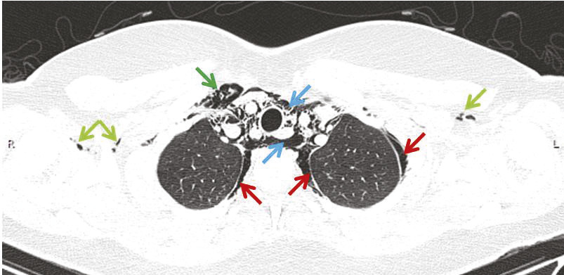 Cette adolescente de 15 ans consultait pour une douleur médiothoracique et cervicale évoluant depuis quelques heures, et une dyspnée sifflante présente depuis 2 jours. Elle avait pour antécédents un eczéma dans la petite enfance et une rhinite allergique. L’examen physique notait des sibilants bilatéraux, une crépitation à la palpation du cou et des creux sus-claviculaires, et une tachycardie régulière avec crépitation rythmée par les bruits du cœur. La saturation en oxygène était à 94 % en air ambiant. La radiographie thoracique (fig. 1) montrait des clartés fines linéaires délimitant le bouton aortique et un emphysème sous-cutané cervico-thoracique, permettant le diagnostic de pneumomédiastin spontané, compliquant une exacerbation d’asthme. Le diagnostic était confirmé par la tomodensi-tométrie(fig. 2). La patiente était surveillée en soins intensifs pendant 72 heures, avec un traitement par corticoïdes systémiques et aérosols de broncho-dilatateurs, puis un traitement de fond par corticostéroïdes inhalés. L’évolution était favorable, avec régression spontanée du pneumomédiastin.