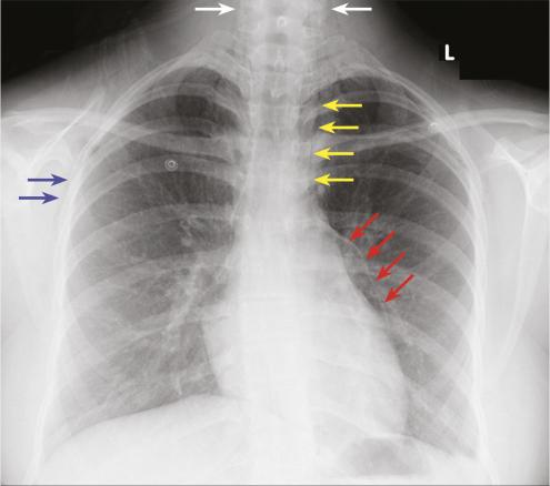 L’exacerbation d’un asthme est la cause la plus fréquente de pneumomédiastin spontané chez l’adolescent,1 par rupture des alvéoles en périphérie des lobules du fait de l’hyperpression intrathoracique. Une douleur brutale, latérothoracique puis médiane, irradiant vers le cou est très évocatrice. L’examen physique montre un emphysème sous-cutané cervical et sus-claviculaire et une crépitation synchrone des bruits du cœur. La radiographie et la tomodensitométrie thoraciques permettent le diagnostic. L’évolution du pneumomédiastin est, en règle générale, spontanément favorable en 72 heures.2
