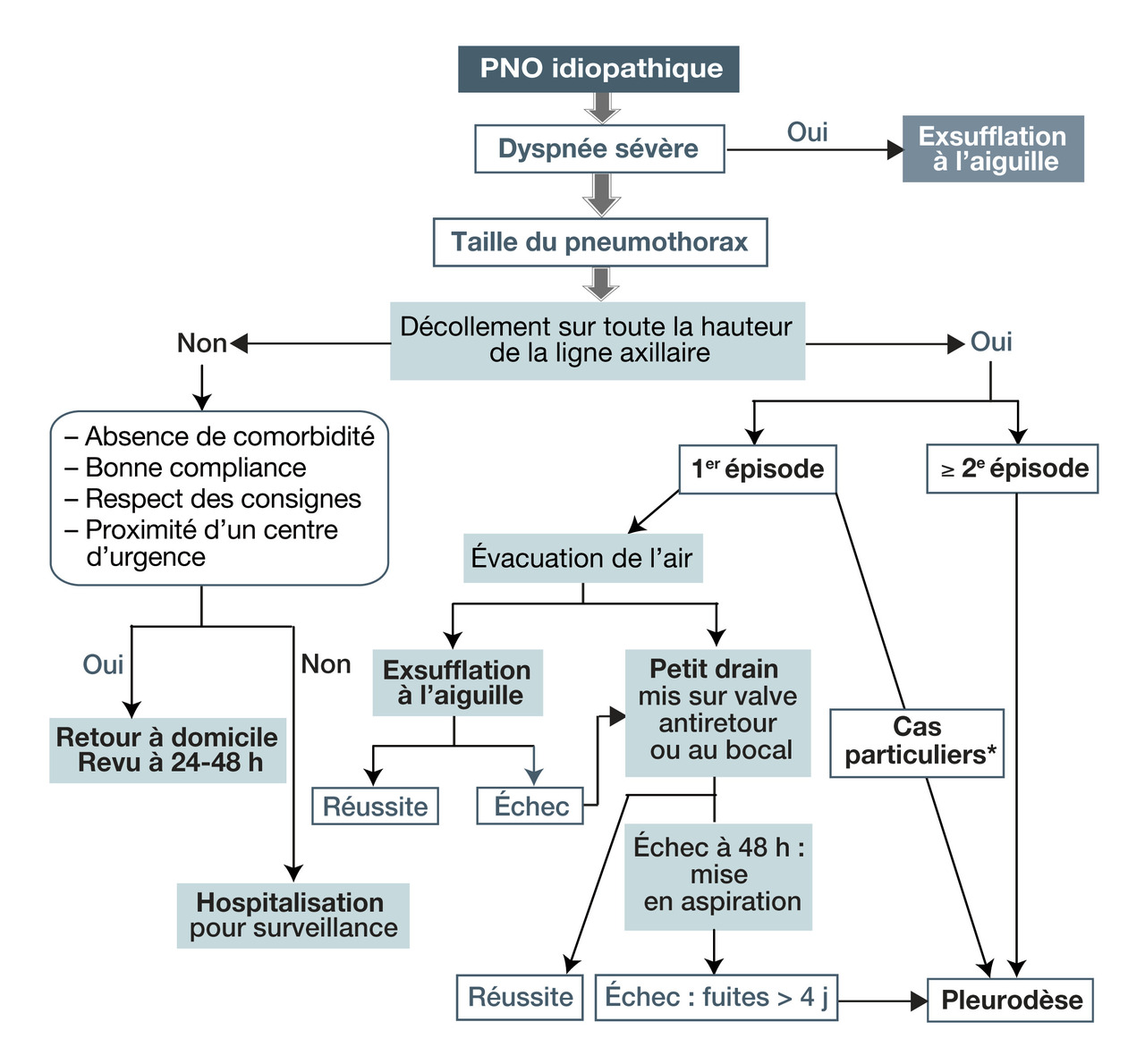 - Si échec ou aggravation, l’évacuation de l’air par exsufflation ou drainage est recommandée.